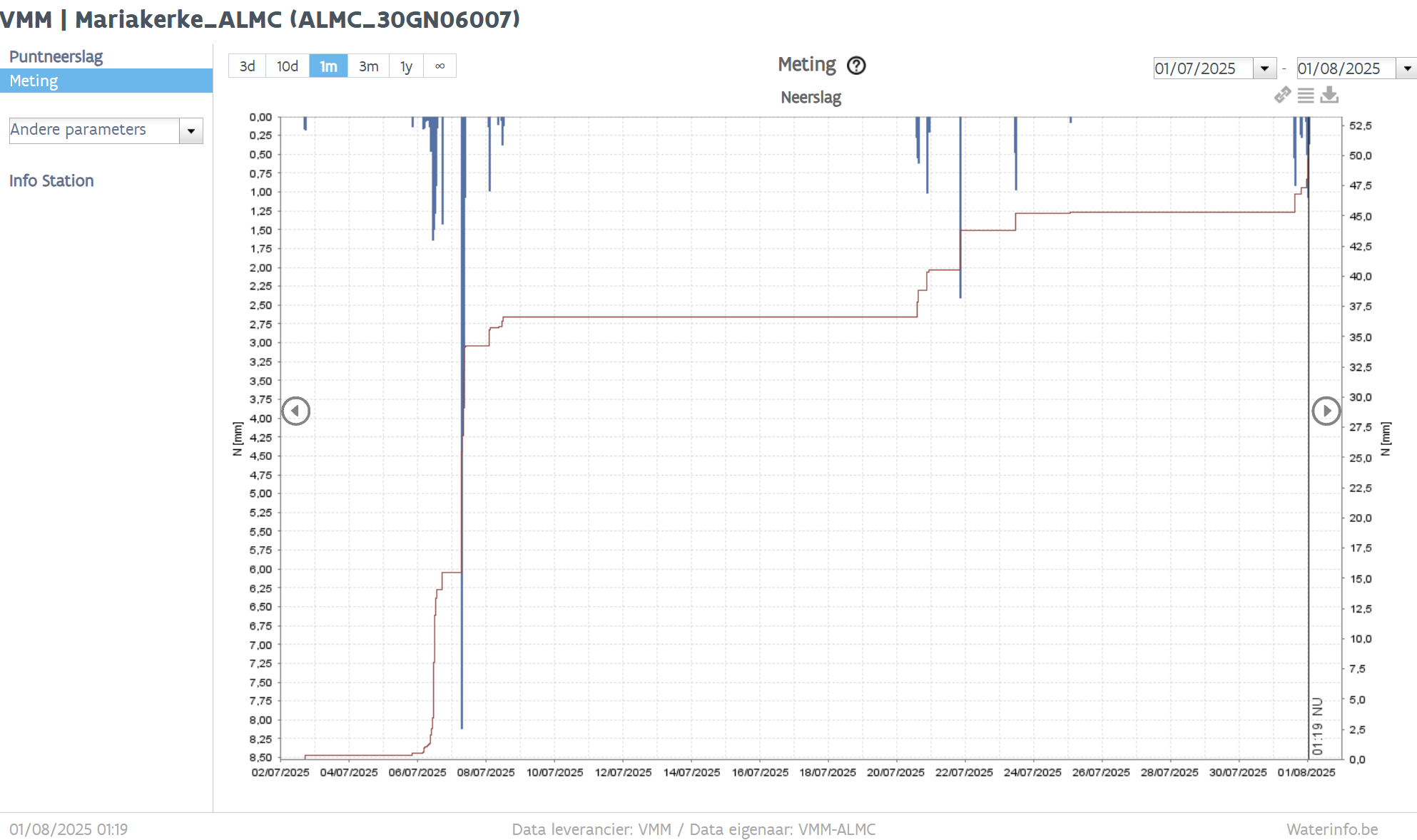 Neerslagtotaal juli 48,14mm (data waterinfo.be)