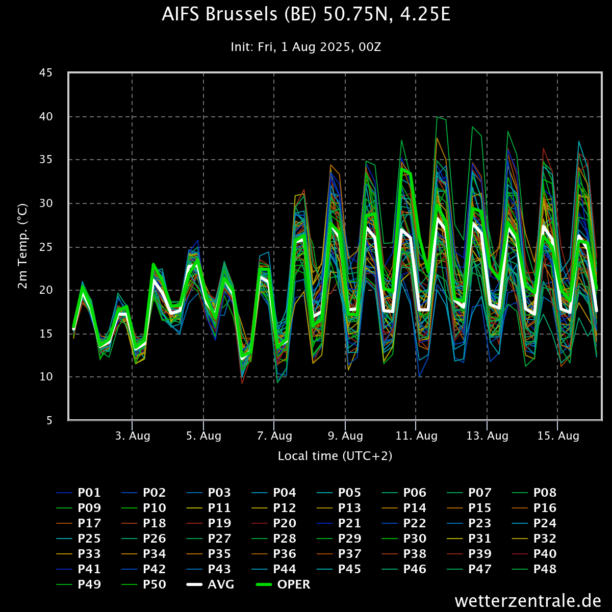 Zelfde beeld voor die van Brussel. Oper AIFS komt met een tijdelijk hitteopstootje op 10/08. Vanaf 13/08 neemt bij de oper de onstabiliteit weer wat toe.