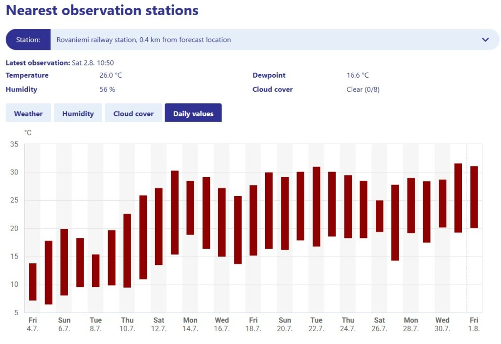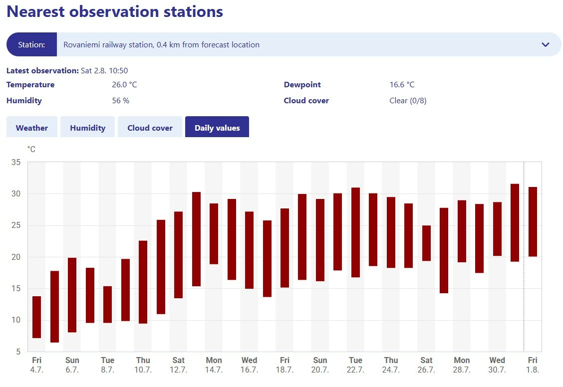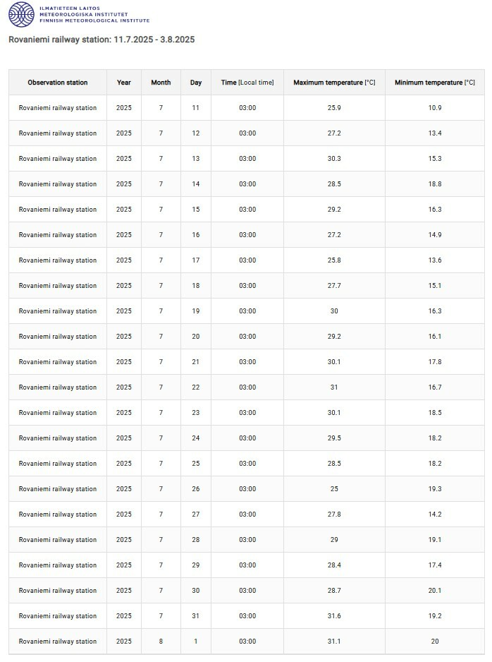 Onderstaand de waarnemingen voor Rovaniemi - vandaag de 23e zomerse dag waarvan 7 tropisch; Er zijn nog talloze andere stations in Finland die sinds 11 juli een onafgebroken reeds zomerse dagen hebben, met meestal 5-10 tropische dagen in de reeks.