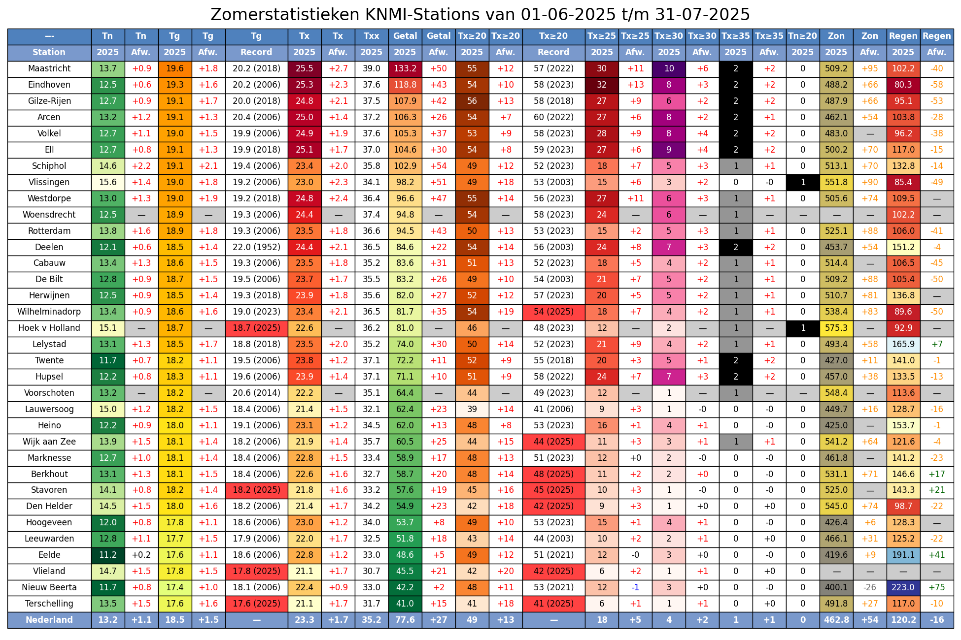 Qua neerslag nog altijd (vrij) droog op veel plekken, met name in het zuiden en zuidwesten. Zo hebben de AWS van Eindhoven, Gilze-Rijen, Volkel, Vlissingen, Wilhelminadorp, Hoek van Holland en Den Helder nog geen 100 mm opgevangen in de eerste twee zomermaanden. Een groot contrast met het noordoosten, waar Eelde (191 mm) en Nieuw Beerta (223 mm) wel forse neerslagsommen hebben gezien.
