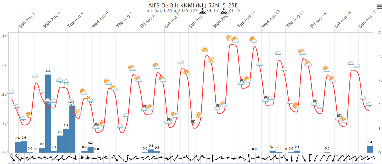 AIFS-oper 12Z De Bilt. Langere tijd droog en heerlijk zomerweer.