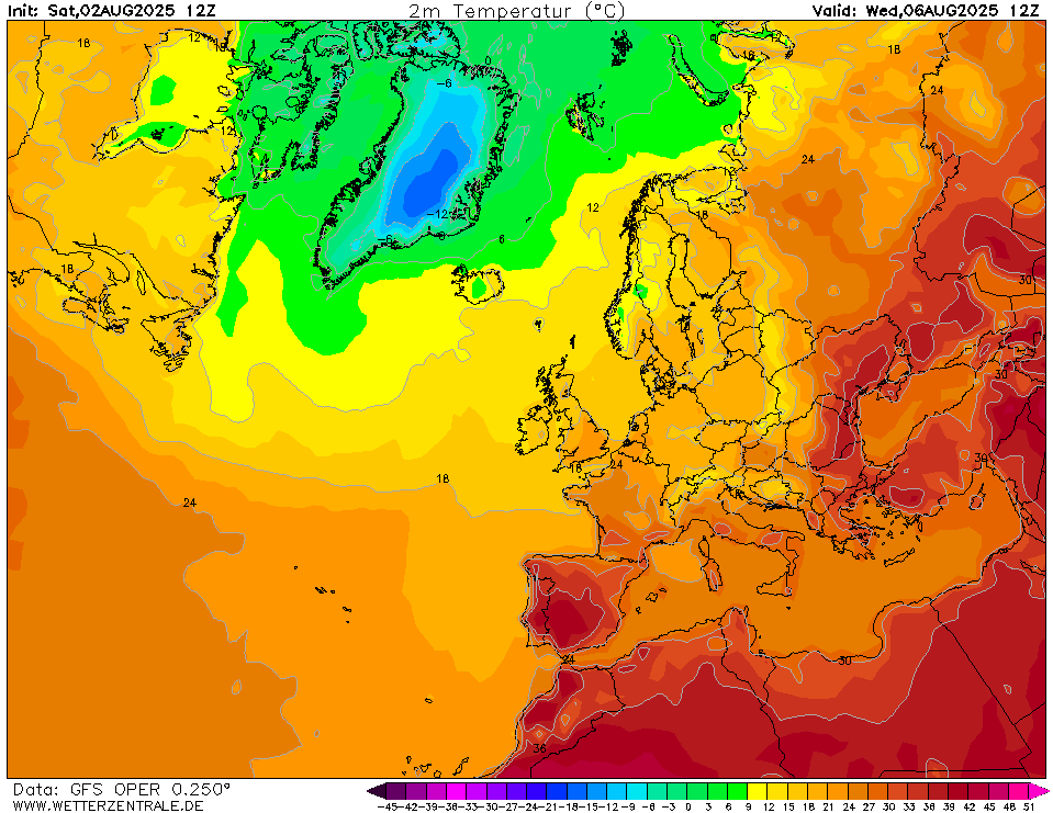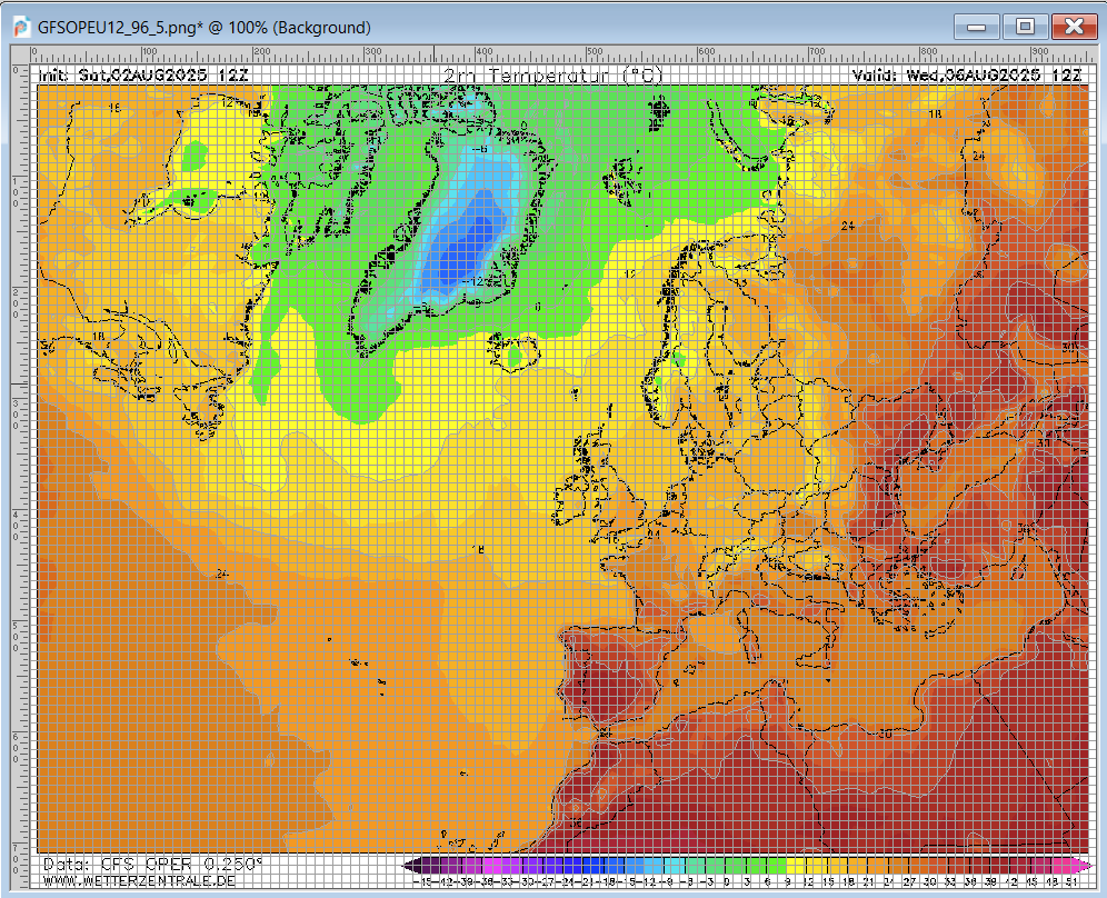Op de gebruikte kaarten wordt de T2m getoond in blokken van 3°C