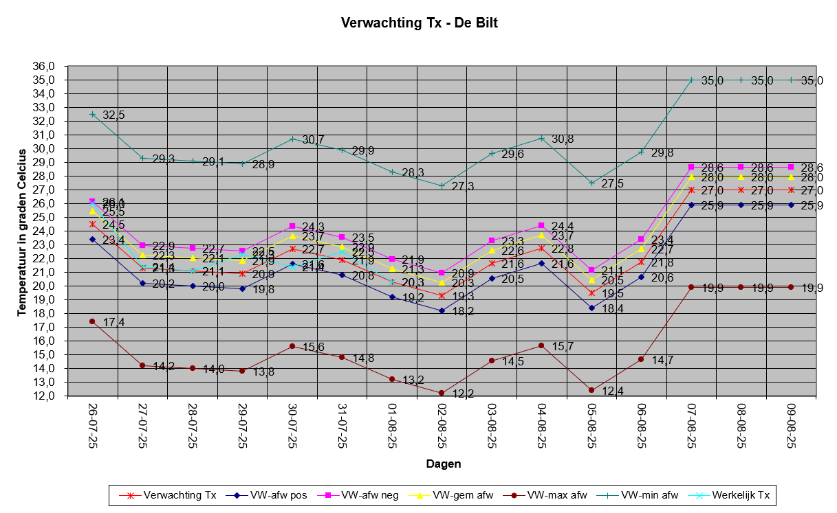Die geeft op dit moment voor 6 augustus een meest waarschijnlijke Tx van 22,4°C