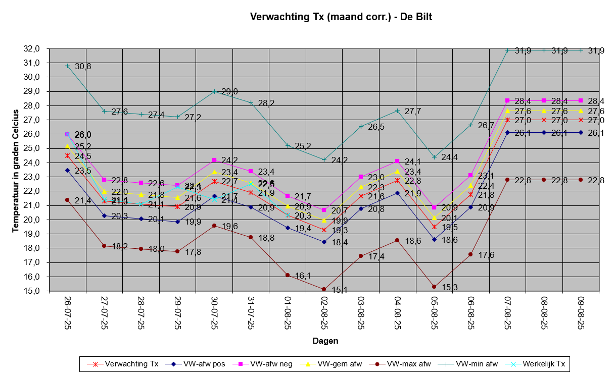 Doordat de standaard afwijking van de hele dataset voor de Tx 1°C is (7,5 jaar aan data), is de verwachting dat de Tx uit komt op 20,5°C