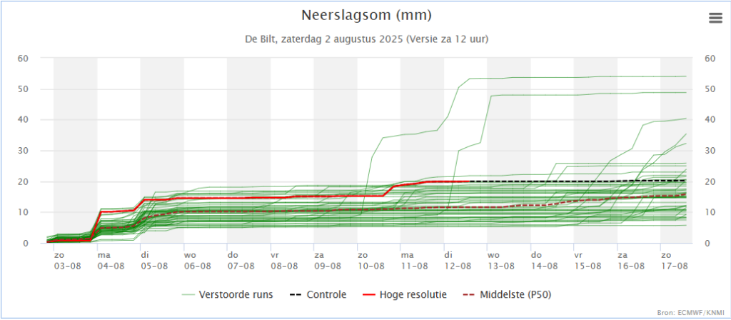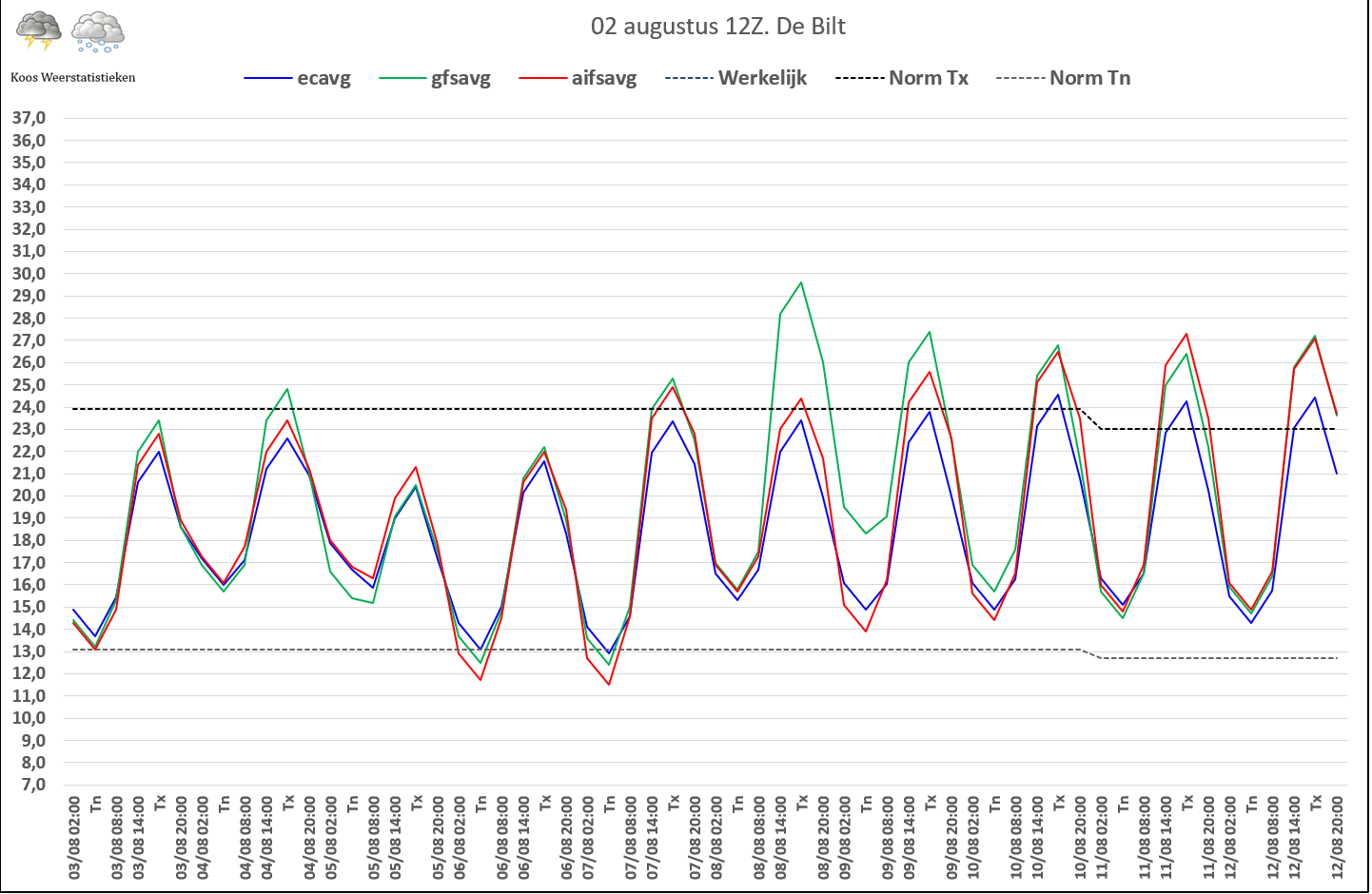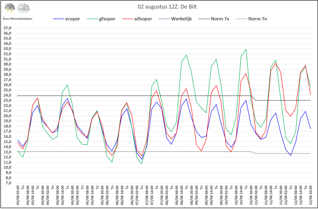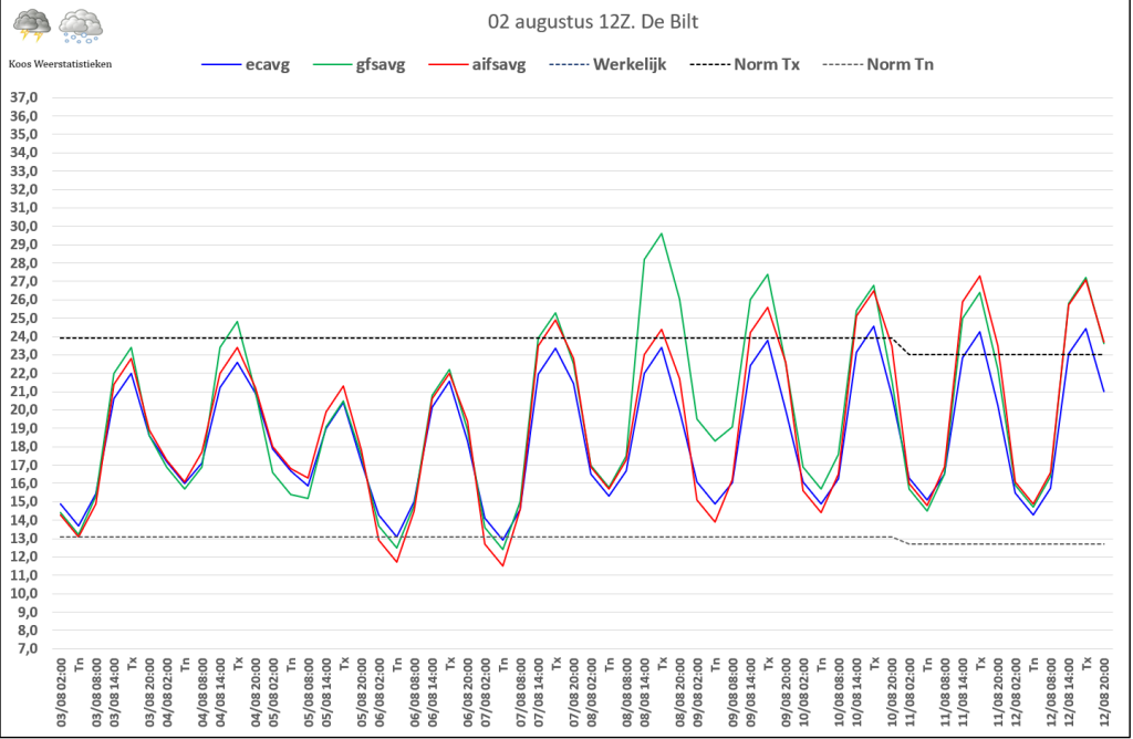 EC oper blijft zelfs de gehele periode beneden de normaal. Daartegenover staan 4 tropische dagen bij de oper van GFS ingetekend.