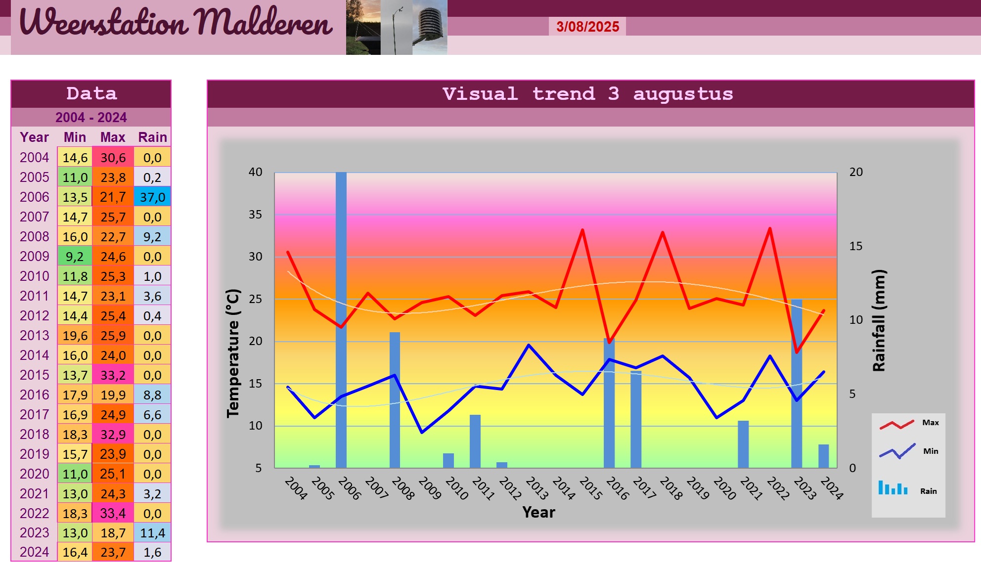 Slapen was de voorbije nacht niet meteen een eenvoudige opgave want een paar uur na middernacht daagden er een reeks buien op die zich kort voor hun aankomst te Malderen verenigden tot een erg pittig buiencomplex waar ook nog eens onweer op zat. Er volgden een paar nabije inslagen terwijl er op regenwater niet werd bezuinigd, doch na een klein uurtje vlaag daalden de rust weer neer over het weerstation. Toen het eerste daglicht het weersgebeuren zichtbaar(der) maakte, bleken er reeds brede opklaringen te zijn die werden onderbroken door stapelwolken en doorwoven waren door vezelachtige, hoge sluierwolken. De stapelwolken ontwikkelden zich fors en zorgden voor een lichte regenbui kort na de middag, maar de grootste zondvloed moest nog komen. Na het wegtrekken van de bui werd het hemelgewelf immers steeds meer gevuld met Cirrostratus en Altostratus en vanuit het noorden kwam een paar uur later de eerste regen binnenvallen welke aan een behoorlijke intensiteit naar beneden stroomde. De uren erop volgden perioden van matige of vrij zware regenval tot in de loop van de avond plots stortbuien binnenkwamen die met neerslagintensiteiten tot net geen 100 mm/h een deel van de tuin rondom het weerstation deden onderlopen. Het dagtotaal kwam hierbij uit op een indrukwekkende 37,0 mm en hoewel de stortbuien kort voor zonsondergang opeens in intensiteit afnamen bleef het nog een ganse avond doorregenen, afgewisseld met droge periodes die hooguit enkele minuten duurden. Er stak tevens een krachtige noordenwind op na de passage van de zwaarste buienlijn die met haar snelheden tot 33,8 km/h eveneens de show wist te stelen. Kleine opklaringen, afgewisseld met laaghangende wolkenflarden en de witte donswolkjes in de blauwe lucht erboven, dreven hierdoor aan duizelingwekkende snelheid voorbij waardoor het een genot was om dit visuele 'geweld' te aanschouwen. Er kwam ook wat zachtere lucht binnengedreven vanuit de Noordzee (oorspronkelijk uit Noorwegen waar het momenteel nog zomers warm is. Maar tropische toestanden werden het zeker niet bij temperaturen die zich tussen 13,5 en 21,7 graden ophielden.