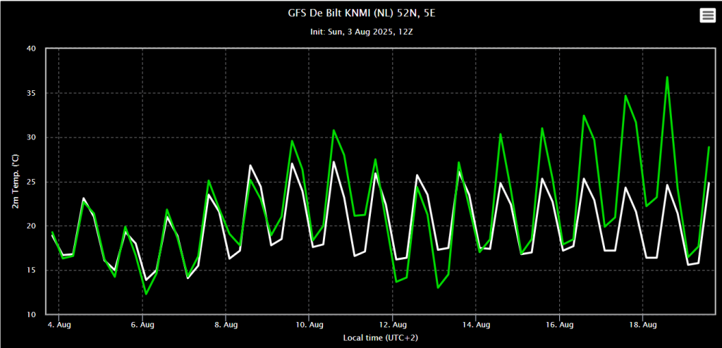 Oper versus ensemblegemiddelde. Kan een lange hittegolf gaan worden
