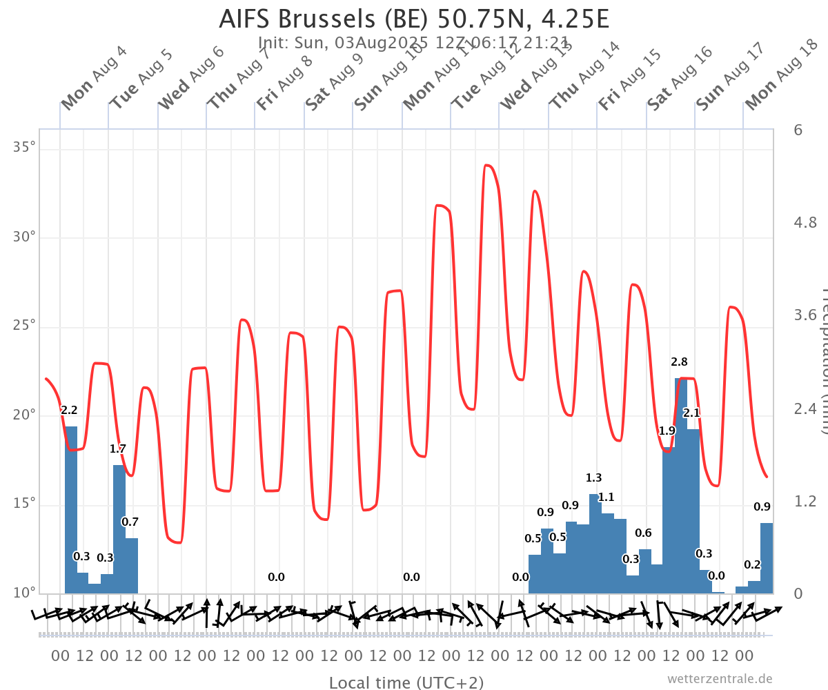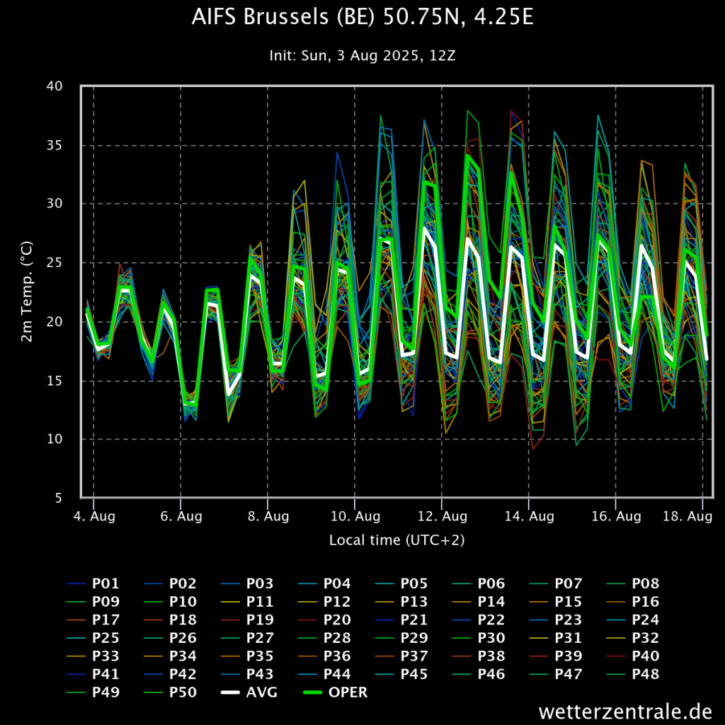 Met tropische temperaturen van 11/08 tem 13/08. ENS is gematigder op die 3 dagen. Dagen ervoor in lijn met de andere modellen, buiten oper GFS.