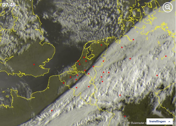 Scherpe begrenzing van de bewolking van Frankrijk tot Denemarken met daarboven een prachtige krul.