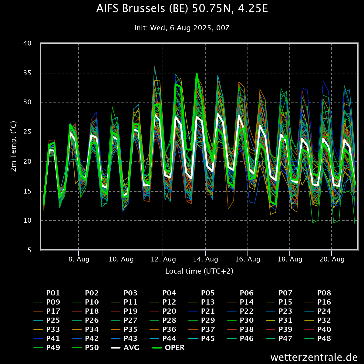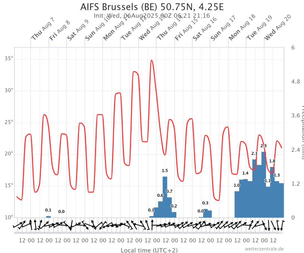 12/08 en 13/08 volgens de oper zekere tropische dagen, 11/08 nipt tropisch. Volgens de Oper is er grote kans op een 2de landelijke hittegolf, maar hangt in 1ste instantie af van maandag. ENS blijft er voor 12/08 en 13/08 gematigder uitzien. Bij AIFS lijkt het, zoals het er nu voorstaat, om een tijdelijke hitteopstoot te gaan tijdens de 1ste helft van volgende week.