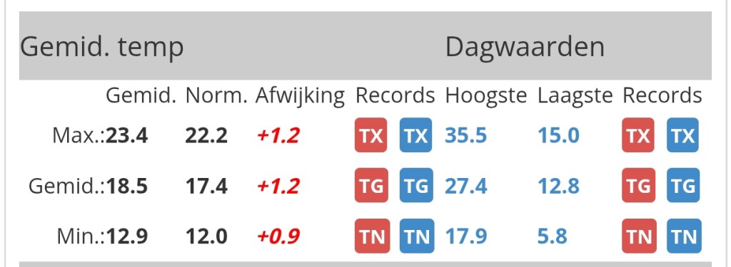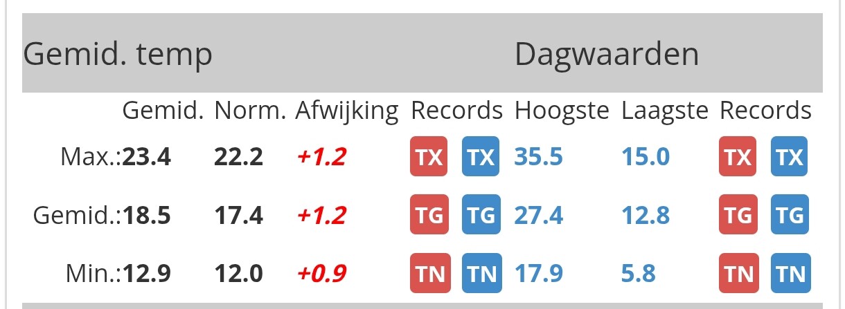 Deze zomer vooralsnog een grotere afwijking in de Tx dan in de Tn. Zal vermoedelijk ook wel zo blijven met het zonnige weer dat op komst is (grote dagelijkse gang in de pluim).