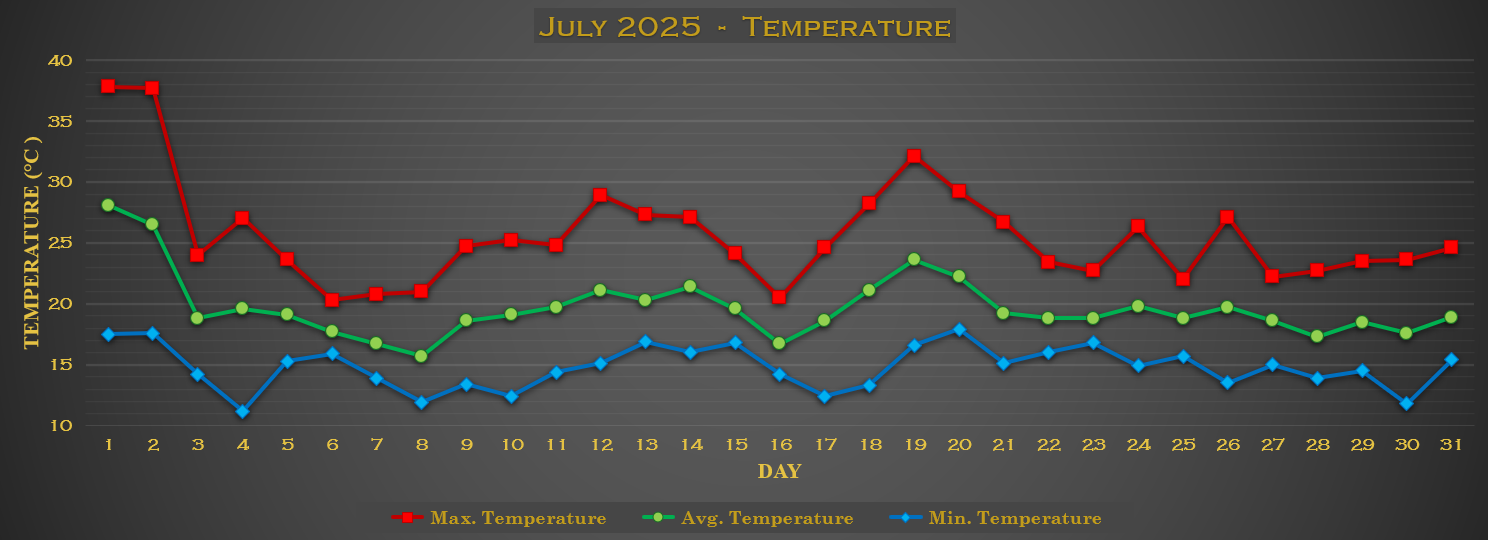 Juli trapte gelijk af met extreme hitte en een korte maar intense hittegolf die begon op 28 juni. Op 1 juli werd het maar liefst 37,8°C en op 2 juli slechts een tiende graad lager. Puffen en zweten! Op 3 juli was de hittegolf echter weer voorbij want de 25°C werd niet meer bereikt.