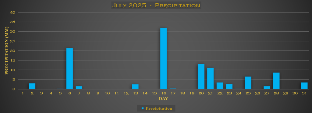 De neerslag was enigszins gelijk verdeeld over de maand, maar de tweede helft was duidelijk wisselvalliger. De neerslagsom bedraagt 112 mm over de gehele maand en dat was voornamelijk te danken aan (zeer) zware buien. Op 6, 16 en 20 juli viel alleen al meer dan de helft van de maandsom aan neerslag! 16 juli is met 32 mm ook de natste dag sinds ik meet (18 juli 2024). Het vorige record stond op 29,9 mm.