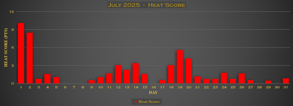 Wat betreft het warmtegetal deed deze maand het ook zeker niet verkeerd, de eindscore bedraagt 58,5 punten. De eerste twee dagen van de maand alleen zorgden al voor meer dan 15 punten! Verder was de periode rond 19 juli ook uitgesproken warmer dan elders in de maand.