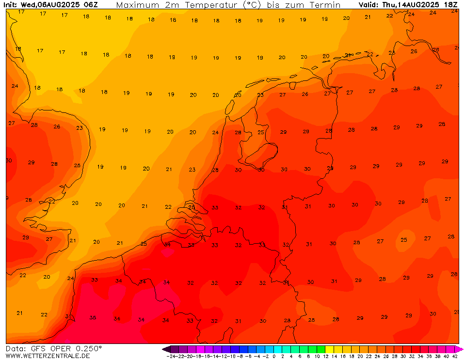 Maandag, dinsdag +25, woensdag, donderdag, vrijdag +30°