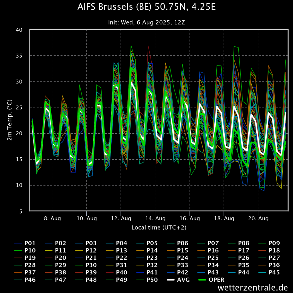 Excuses als ik die van Brussel altijd onder jouw post zet, maar maakt het overzichtelijker en worden wij als Belgen ook niet vergeten. Hittepiek op dinsdag. Ervoor en erna blijvend aangename zomertemperaturen. Tendens bij alle modellen lijkt nu dat dinsdag de warmste dag gaat worden.