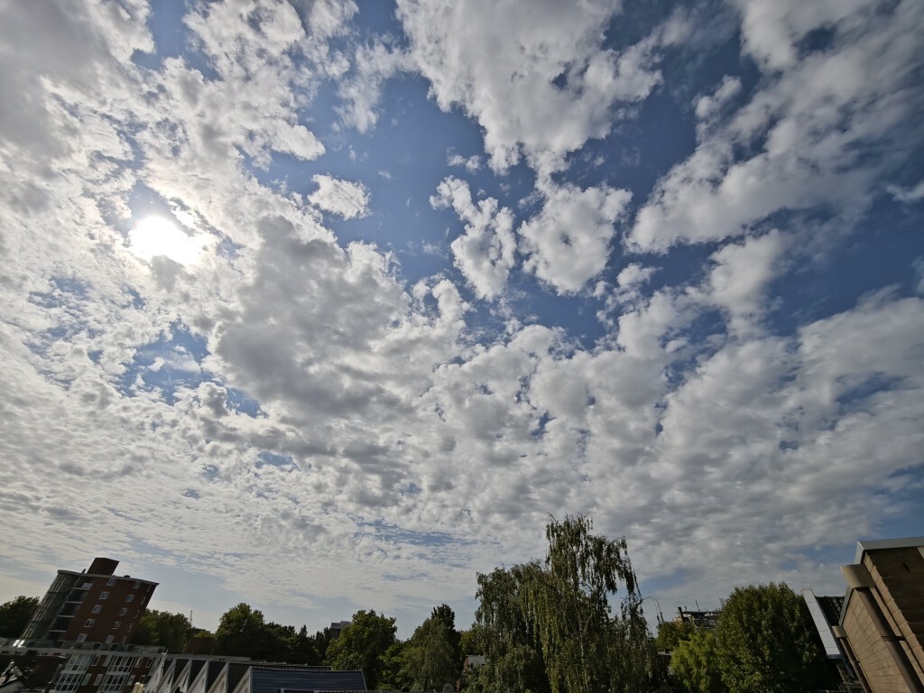 De zon speelt hier wat haasje over met altocumulus bankjes bij een puike 22.2c en zzw 3 bft
