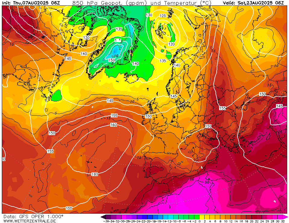 Als we de uitvoer dan toch zo letterlijk nemen zo ver in de toekomst, dan zien we op de laatste kaart juist dat het Azorenhoog weer een brug boven ons hoofd slaat en tevens met de kern richting het oosten beweegt. Dat zou dus ook heel goed kunnen uitmonden in een herhaling van zetten met het doorschuiven van aparte hogedrukuitlopers, (korte) warmte-/hitte opstoten en dus een laat augustus- en wie weet nog septemberzomertje