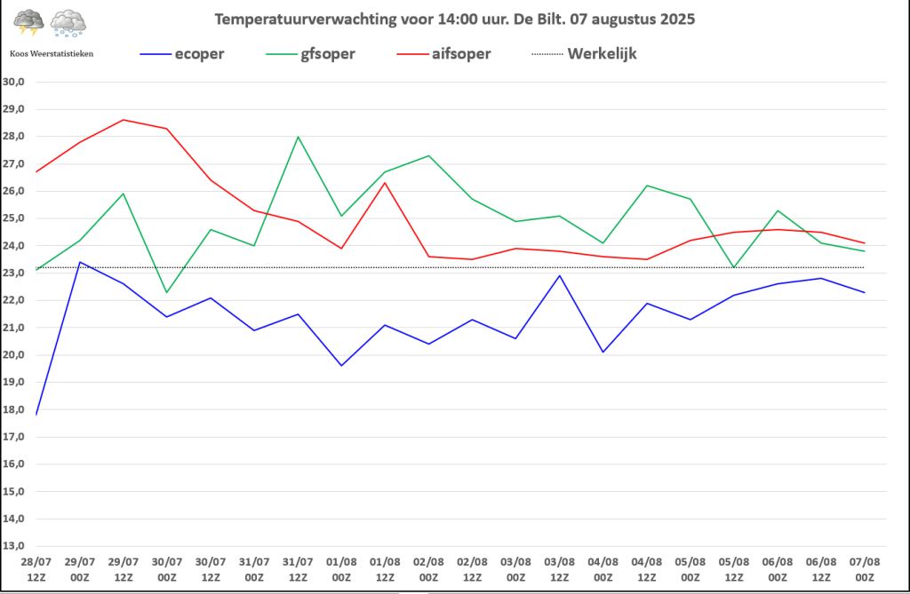 Over de laatste 14 pluimen had EC-oper een absolute afwijking van 1,7 °C, GFS-oper van 2,2 °C en AIFS-oper van 1,0 °C.