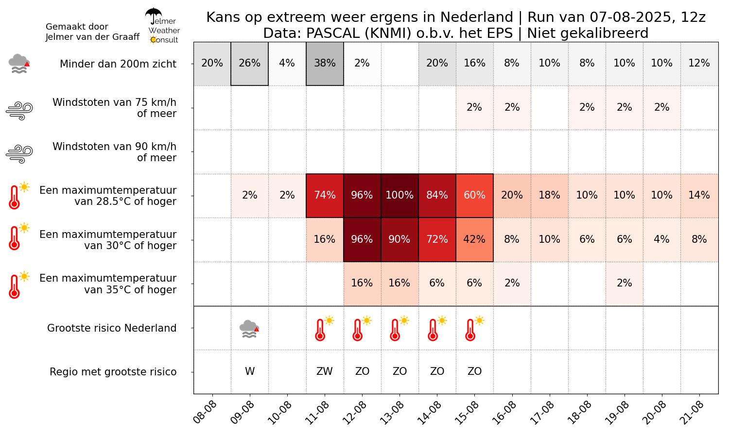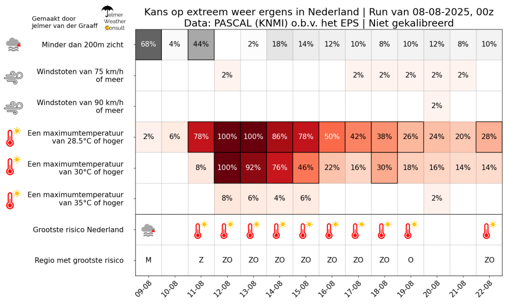 KNMI had het o.b.v. de pluim gisterenavond over 80% kans in het zuiden en 30% in het noorden. Midden van het land (De Bilt) zal daar ergens tussenin zitten. En ten opzichte van gisterenavond zijn de kansen op warmte nog wat verder toegenomen in het EPS.