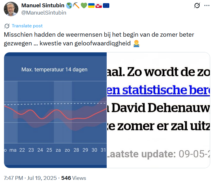Ik zit ook op twitter en vind het grappig dat mensen, ook serieuze mensen zoals hier onder een prof geologie aan de KUL, bij aanvang van de wat wisselvalligere en frissere periode een aantal weken geleden onverstandige posts zoals deze de wereld in sturen: