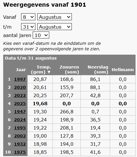 Dan wordt het zomergemiddelde van (afgerond) 18.9°C geëvenaard. De verwachting van Weerstatistieken voor de betreffende periode is momenteel 19.7°C op basis van het EPS. Er is dus nog altijd een (serieuze) kans dat het de warmste zomer ooit gemeten wordt, al dan niet samen met 2018.