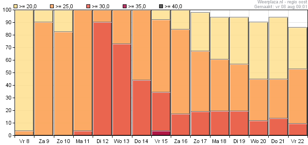 Tot nu toe wel, maar de komende tijd lijken we aan de lopende band zomerse dagen te gaan scoren, terwijl De Bilt er van 8 t/m 31 augustus 2018 slechts drie noteerde. Of we de 37 dagen uit 2018 gaan halen valt te betwijfelen, maar 30 of meer zal vast wel lukken.