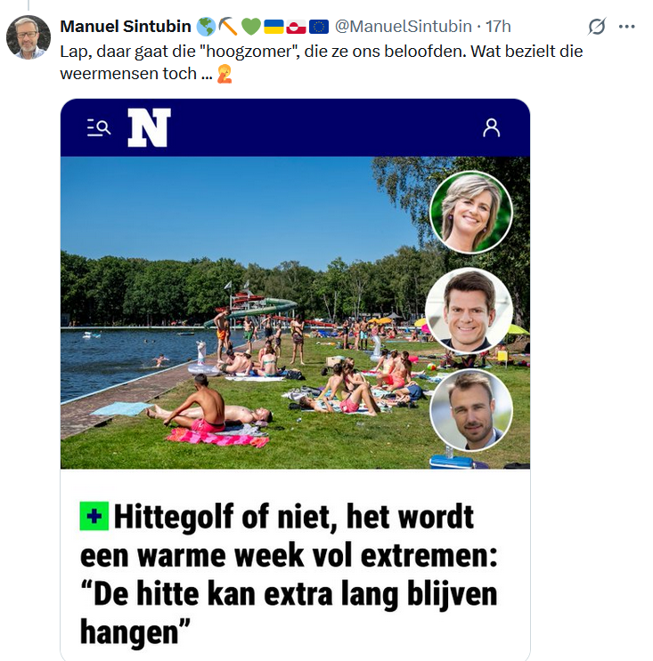 Ik ben bekend met Sintubin en neem hem, buiten als het over zijn vakgebied geologie gaat, ook helemaal niet serieus. Maar ik zag toen midden juli verschillende gelijkaardige tweets, ook van andere geleerde mensen (bv de professor psychologie aan de Ugent Duyck - ook niet vies van onverstandige en provocerende uitspraken). Van zulke mensen zoudt ge nuance en het inzicht dat een tijdelijke dip in de zomer wat anders is dan statistieken over de gemiddelde zomer verwachten.