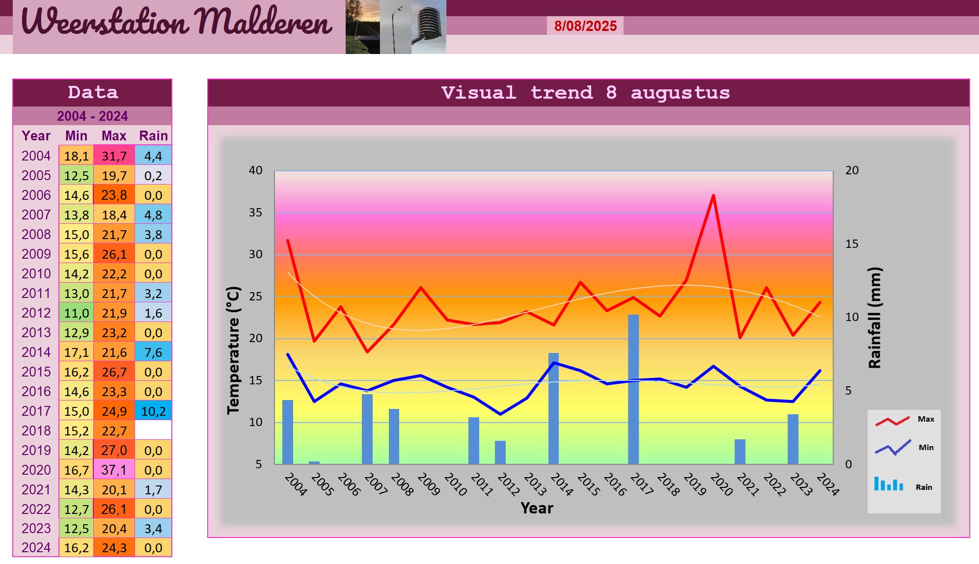 In de loop van gisteravond is het te Malderen opnieuw tot onweer gekomen. Het begon eerst met wat gedreig vanuit het oosten en zuidoosten, en nadien kondigde een eerste weerlicht de komst van de "vuurbrigade" aan. Het onweer was redelijk actief bij zijn aankomst hier, en er viel weer een aardige plens regen, doch in vergelijking met andere stations, vooral in het centrum van het land en ten oosten van ons was de 4,4 mm die hier afgeleverd werd niet overdreven veel. Na het onweer is het nog een tijdje blijven naregenen en het was duidelijk te zien dat ook de bliksemactiviteit eruit ging eens het onweer Malderen voorbijgetrokken was. De temperaturen zakten naar een nog steeds zwoele 18,1 graden, en vandaag begonnen we dag onder heldere hemel waarbij een blinkende augustuszon het kwik weer flink de hoogte injoeg, resulterend in een maximum van 31,7 graden. Er stond aardig wat wind, maximaal tot 26 km/h, maar op het moment dat dit verslag tot leven komt is het nog steeds 30,8 graden warm. Het ziet ernaar uit dat de zomer vanaf nu zal terugkoppelen met de aankomst van ex - tropische storm Alex die door een oceaandepressie verzwolgen werd en nu in de vorm van een erg actieve depressie langzaam onze kant opkomt. Dit zou zoals het er nu naar uit ziet vooral op dinsdag aardig wat klank en lichtspektakel opleveren. Het wordt ook minder warm, maar zeker nog niet koud.