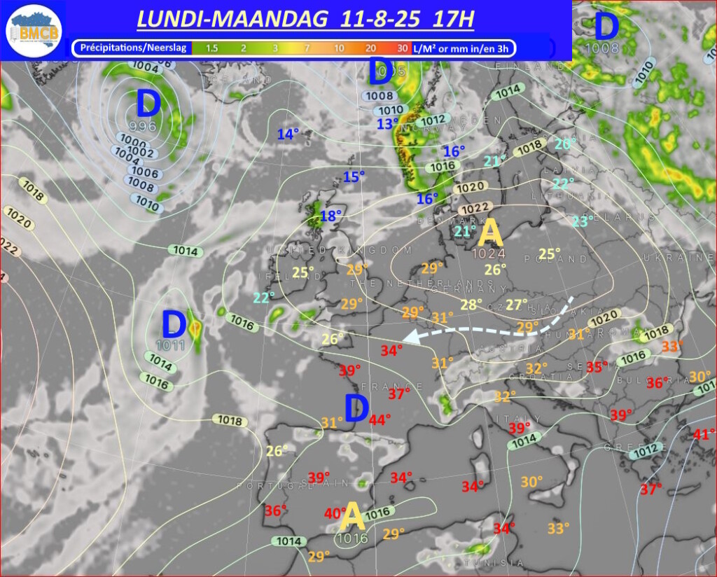 Daarna zal een uitgestrekt gebied met weing drukverschillen zich over West- en Centraal-Europa uitbreiden.