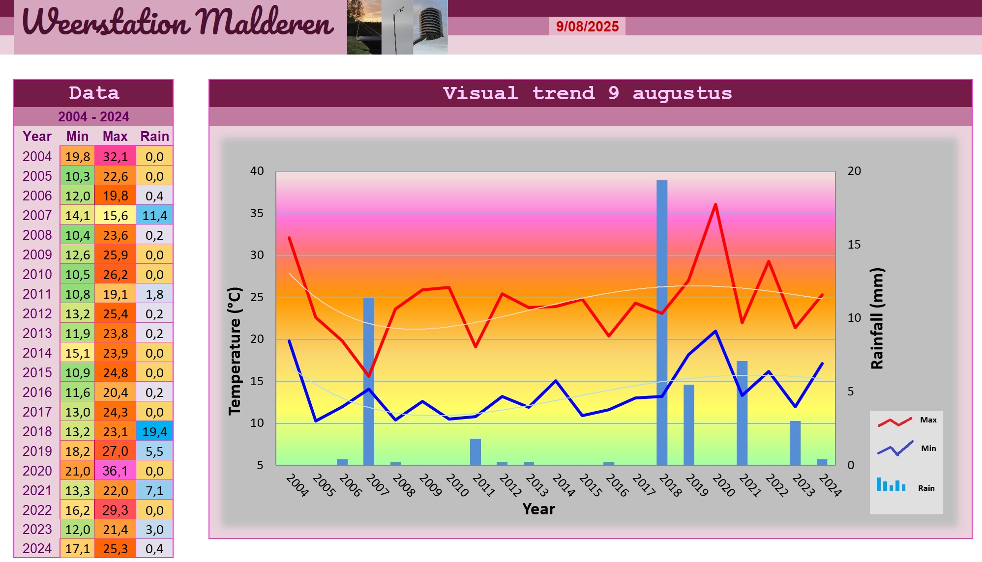 Kort voor zonsopgang werd de westelijke hemel gedomineerd door een ontwikkelende onweerscel die spoedig het volwassen stadium bereikte. Hoewel er van hieruit geen donder of bliksem waarneembaar was, was het geheel best imposant en indrukwekkend te noemen. Achter deze cel was een tweede exemplaar beginnen te ontwikkelen, doch op het Malderse grondgebied heeft dit geen pluviale gevolgen teweeggebracht. Integendeel, de zon kwam er in de loop van de dag flink aan te pas, en het kwik was er dan ook als de kippen bij om in een ruk naar boven te schieten, uitmondend in een opnieuw zeer hete 32,1°C. De ochtendminima mogen er trouwens ook wel wezen, met een plakkerig warme minimumtemperatuur van 19,8 graden. De wind haalde uit tot 16 km/h, en nu de avond begint te vallen is de bewolking weer gaan toenemen vanuit het westen. Dit zou de komende 48 uur kunnen uitmonden in lokaal flinke onweders, maar het ziet ernaar uit dat het allemaal heel plaatselijk zal zijn, en dat op sommige, zoniet de meeste plaatsen, de overgang naar koeler weer zonder slag of stoot zal gebeuren, het is zelfs mogelijk dat het droog blijft. De atmosfeer blijft echter onstabiel en de kans op een (lichter) onweer blijft er zeker tot het einde van de werkweek inzitten bij temperaturen rond 23 graden...