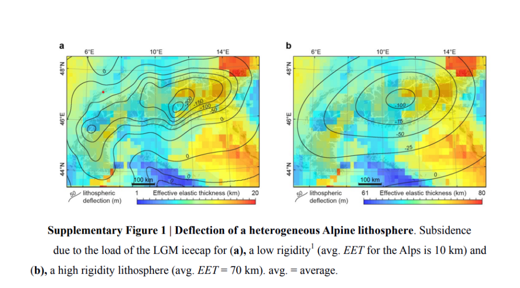 Hoeveel de aardkorst tijdens het glaciaal naar bededen werd gedrukt hangt af van de stevigheid van de ondergrond. Die is niet precies bekend, en daarom zijn er twee varianten uitgerekend.![]()