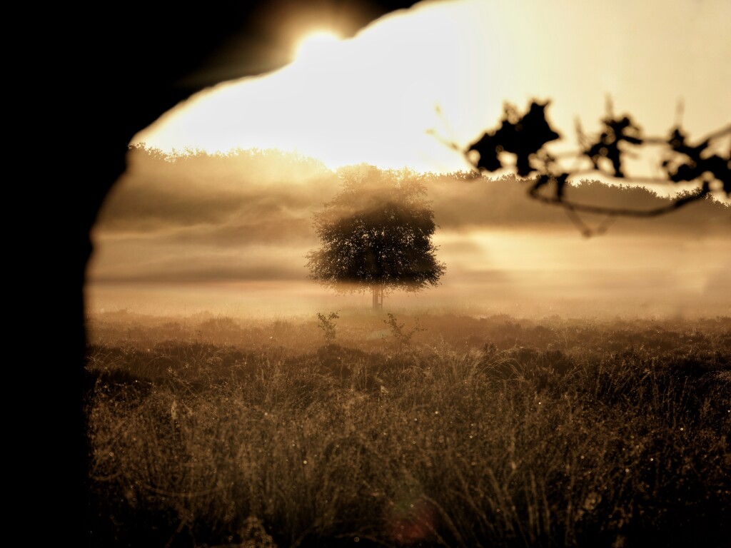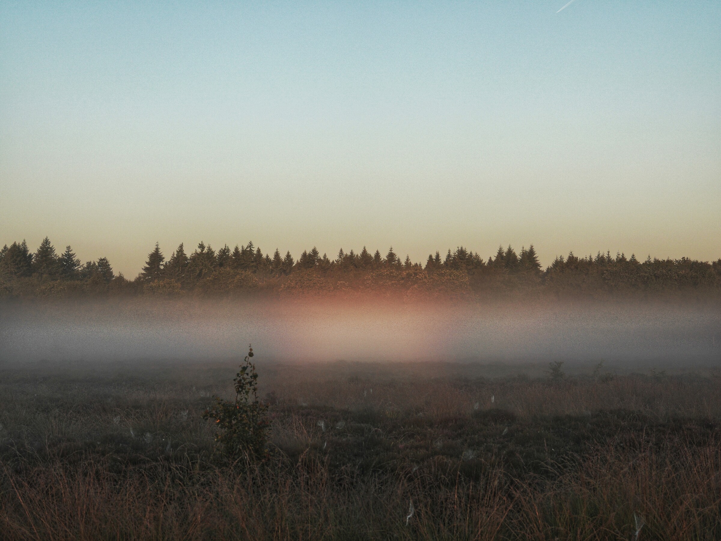 Een half uur later begonnen de mistbanken opeens over de heide heen te rollen. Ik denk doordat het bos aan een kant van de heide schaduw gaf en de rest van de heide al snel begon op te warmen.