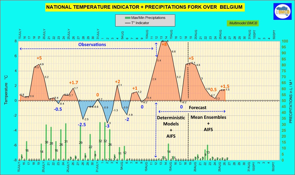 Op 13 en 14 augustus bereikt de nationale temperatuurindicator een piek van +8, met maxima van 28 tot 36°C in België.