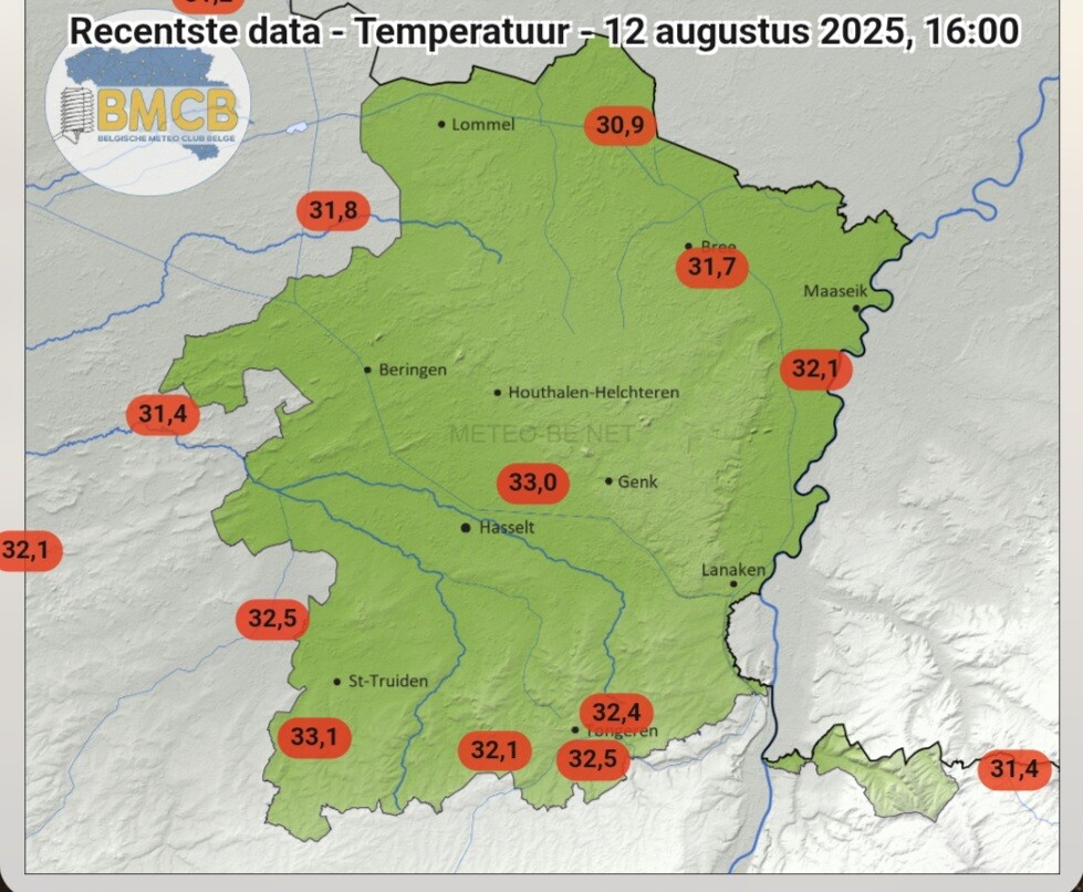 Tact 15:30 uur, meerdere stations inmiddels boven de 32°C
