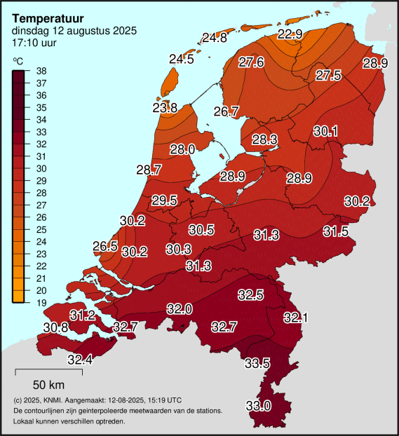 Hier net een piek van 32°C 12km landinwaarts.