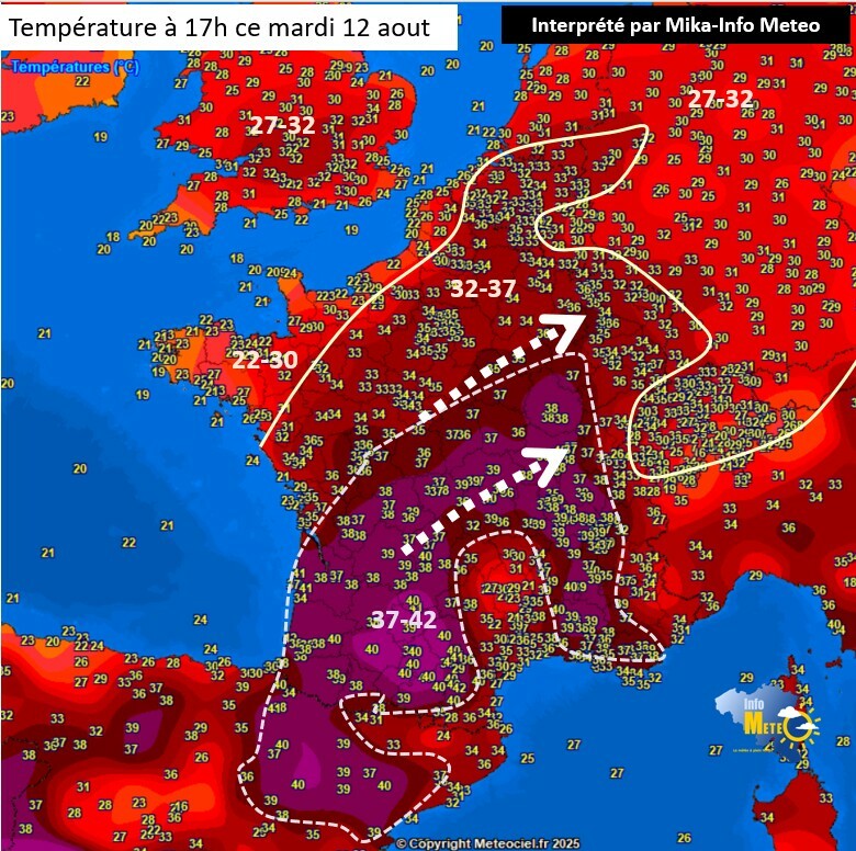 West-Europa zweet: Frankrijk zit midden in de oven met 30 tot 42°C, de hoogste waarden in het zuidwesten. Bij ons is het ook heet, maar minder extreem: 31 tot 34°C in de laagvlakten, tot 35°C nabij de Franse grens, wat koeler aan de kust (21-22°C zeewater) en onder de 30°C op de hoogtes.