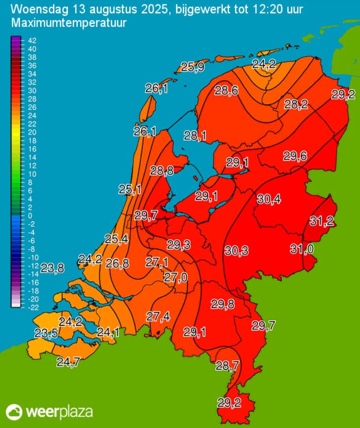 Tact 30,4°C, AWS Twente een paar km verderop een graad hoger