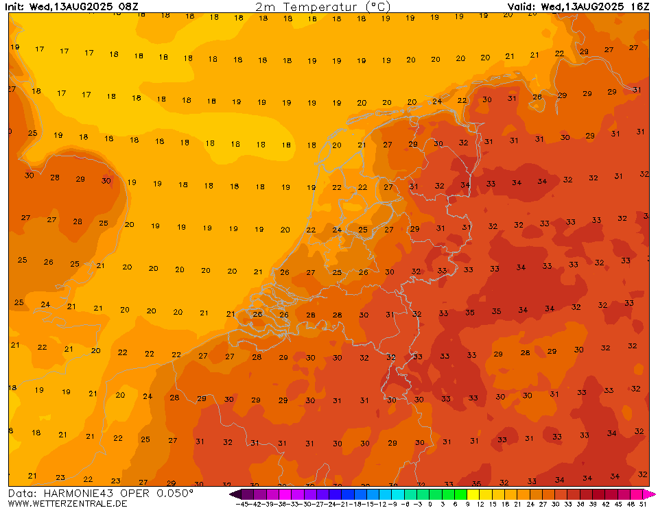 Wellicht 10 min even een 35 piekje? Verder verwacht ik dat het niet verder komt dan 33,5 a 34,0 er komt wat westenwind landinwaarts, een vore?