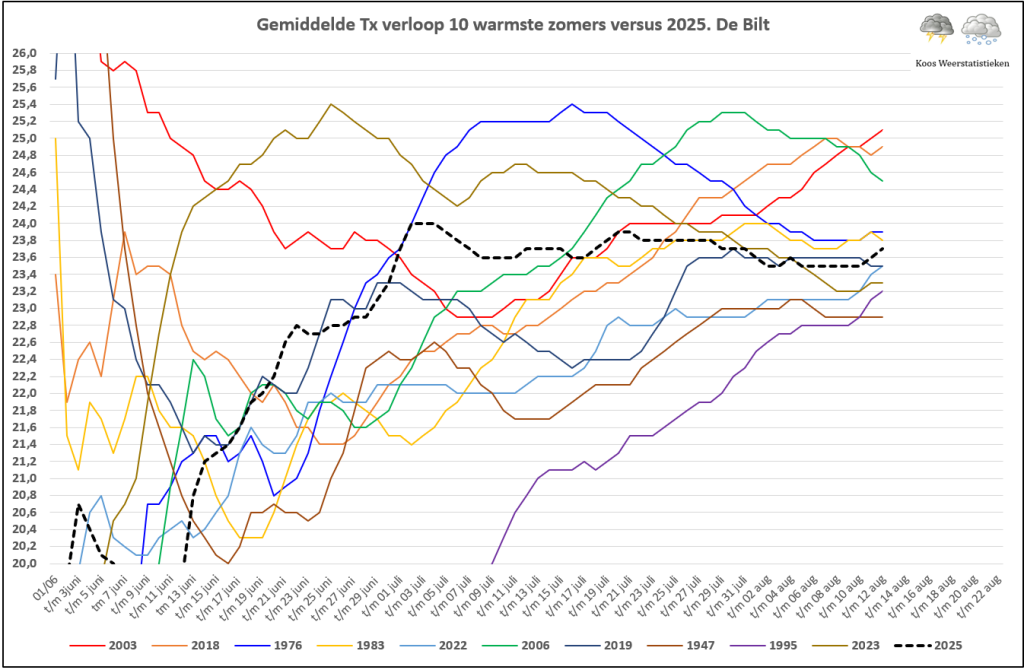 Je kunt in dit overzicht mooi zien welke zomers ook goed presteerden rond deze tijd. 2003, 2022 en 1995 waren bezig aan een echt warme periode rond deze datum.