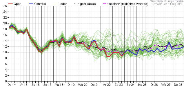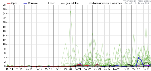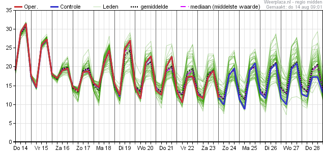 Vrijdag bevinden we ons nog in warme en ook vrij vochtige lucht, met landinwaarts nog tropische temperaturen. De kans op buien is dan alweer geweken en vanaf het weekeinde komen we ook echt in een andere luchtsoort terecht. Begin volgende week wordt de temperatuurverwachting onzeker; met ca. 75% kans op een volgende maar kortdurende warme periode. De kans op tropische temperaturen landinwaarts is dan vrij groot (ca. 60% kans). In de tweede helft van volgende week daalt die kans weer naar ca. 25% en zien we juist de neerslagkansen toenemen (ca. 50%) a.g.v. wat meer cyclonaliteit in het stromingspatroon. Halverwege komende week is er daarbij ook kans op onweer en flink wat neerslag.