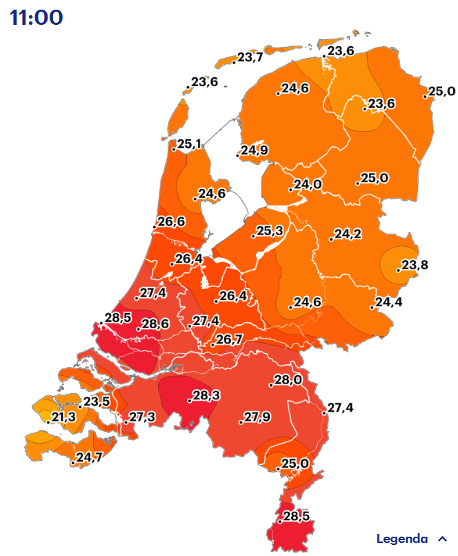 Na een initiele piek van 26,0 C om 9 uur nu lekker verfrissend 23,3 C.