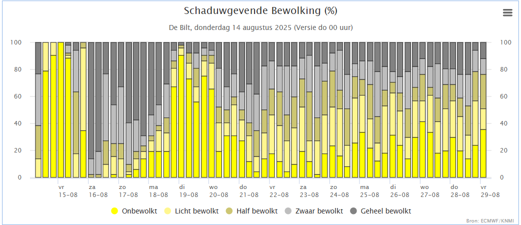 Ook de hoeveelheid verwachte zonneschijn neemt verder af. De neerslagsom blijft maar weinig voorstellen.