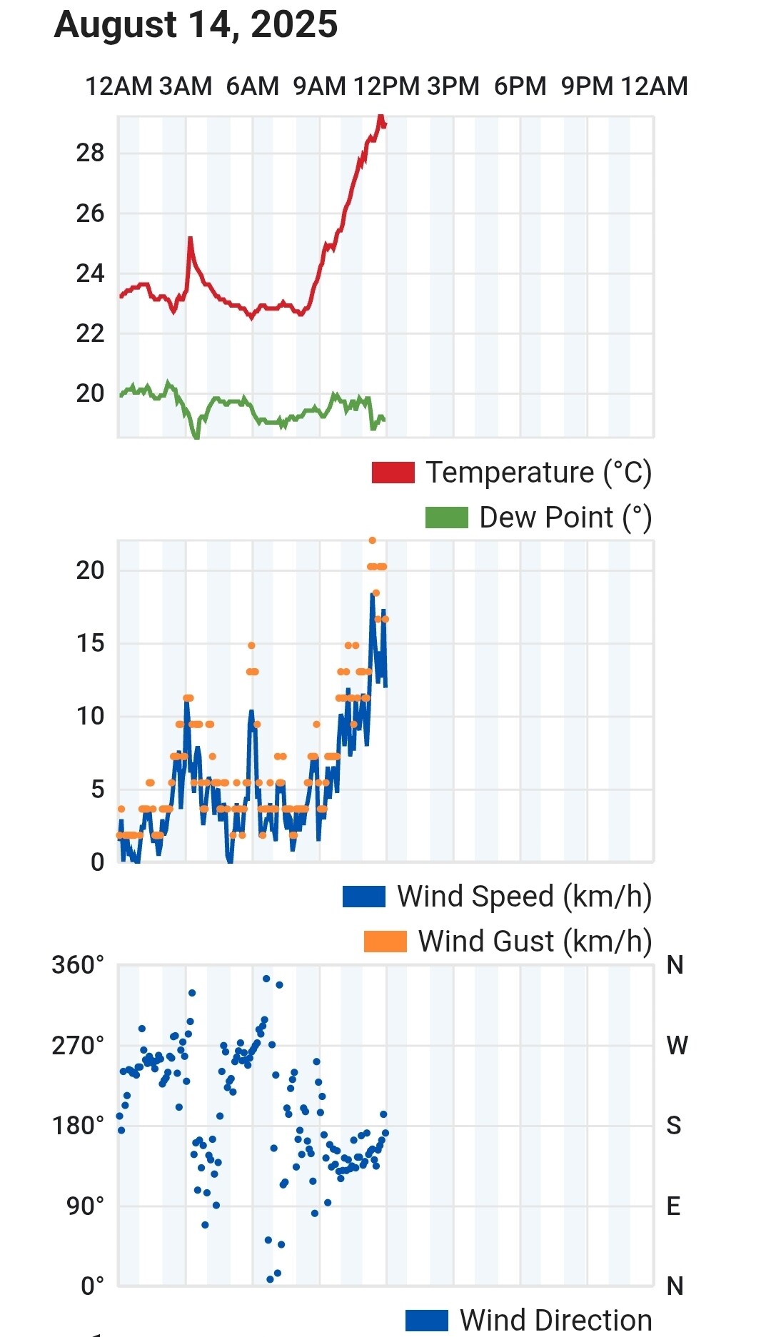Na een initiele piek van 26,0 C om 9 uur nu lekker verfrissend 23,3 C.