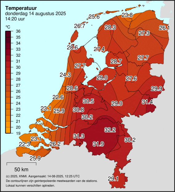 Edit: sinds begin van de metingen is dit pas de 2e keer dat het op 14 augustus tropisch geworden is te De Bilt. De eerste keer was in 2022 en dat jaar heeft (vooralsnog) ook nog het datumrecord met 32,2°C.