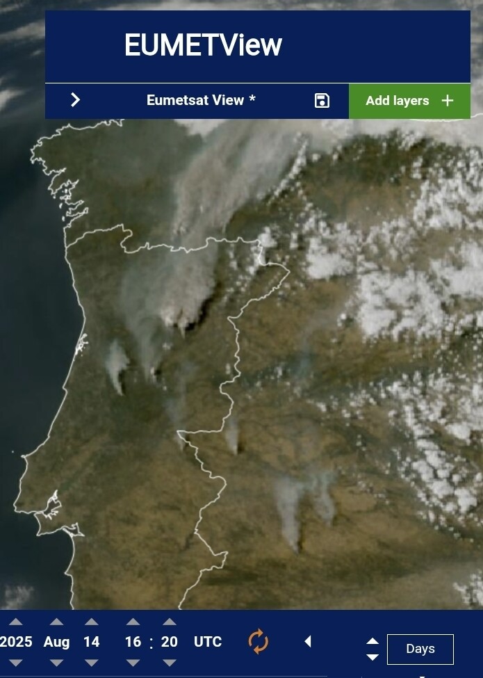 Grote brandhaarden met rook die zich inmiddels tot aan Bretagne uitstrekt.