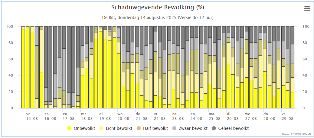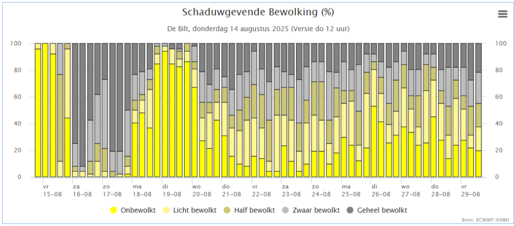 Het weekend verloopt bewolkt, dan 2 dagen volop zon, maar daarna ook niet overtuigend zonnig.