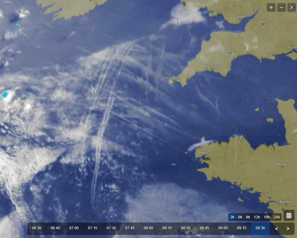 Op het satellietbeeld is nu een fors gebied te zien met rechte strepen, die naar het noorden trekken. Dit duidt op een stroming op enkele kilometers hoogte. Het lijkt me dat deze veroorzaakt zijn door scheepvaartverkeer. Dan is de uitstoot daarvan toch nog niet zo schoon dat er geen wolken meer door ontstaan. Er zijn stijgende bewegingen nodig om deze wolkenvorming te kunnen geven, als de bron de uitstoot van scheepvaart is, en uiterraard voldoende vocht. Vandaar dat je dit maar af en toe ziet.