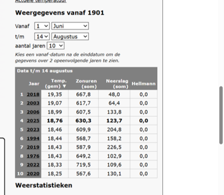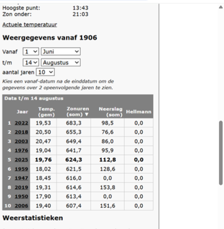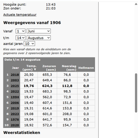 Op basis van representatieve statistieken voor een groot deel van NL (De Bilt) en een groot deel van Vlaanderen (Maastricht) is de zomer van 2025 nog steeds serieus op weg naar de absolute top, althans wat de relevante parameters Tg en Zon betreft.