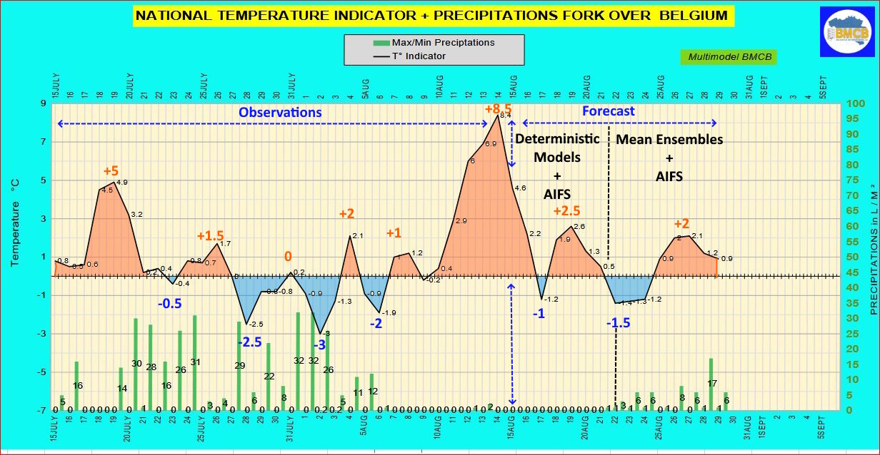 Een lichte opleving wordt verwacht op 18 en 19 augustus, met een indicator van +2 tot +3 (oftewel 21 tot 29 °C in de namiddag), gevolgd door een nieuwe dip tussen 22 en 24 augustus.